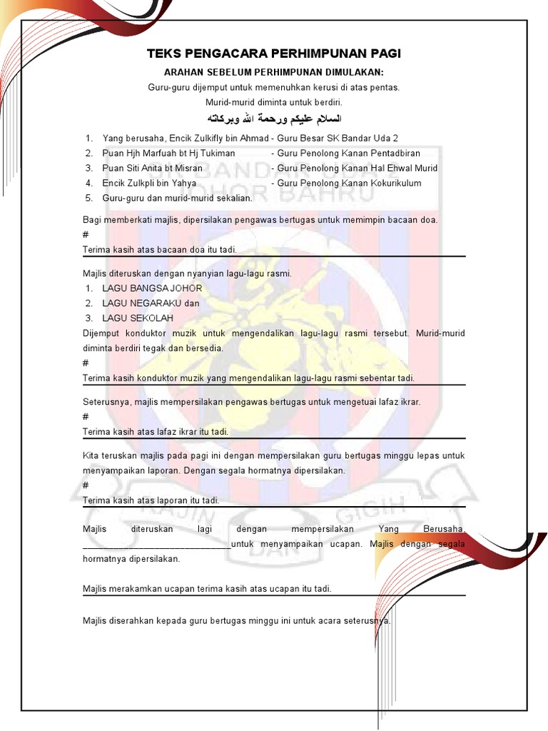 Bagi memberkati majlis perhimpunan di pagi yang mulia ini, majlis menjemput saudara _ untuk membacakan doa. Ucapan yb dr maszlee bin malik. Sk menson cameron highlands 4 years ago. Teks ucapan guru bertugas mingguan mp3 & mp4. السلام عليكم ورحمة الله وبركاته.